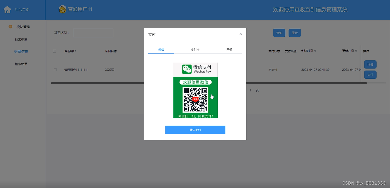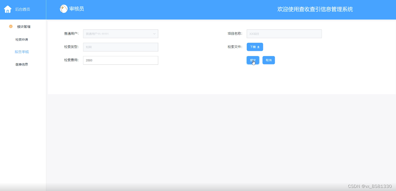 缴费信息:待检索申请交由检索员和审核员审批通过,用户接收到缴费信息进行缴费。