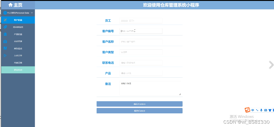 员工用户进入系统首页可以查询功能:首页、个人资料(个人信息、修改密码)、客户信息、供应商信息、产品信息、仓库管理、库存盘点、入库订单、出库订单等功能,如图5-7所示。
