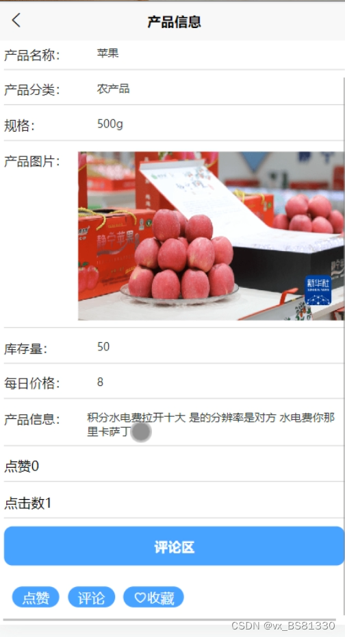 产品信息,农户可以在产品信息页面中查看产品信息详情,并可进行点赞、收藏、评论等操作,如图5-11所示。