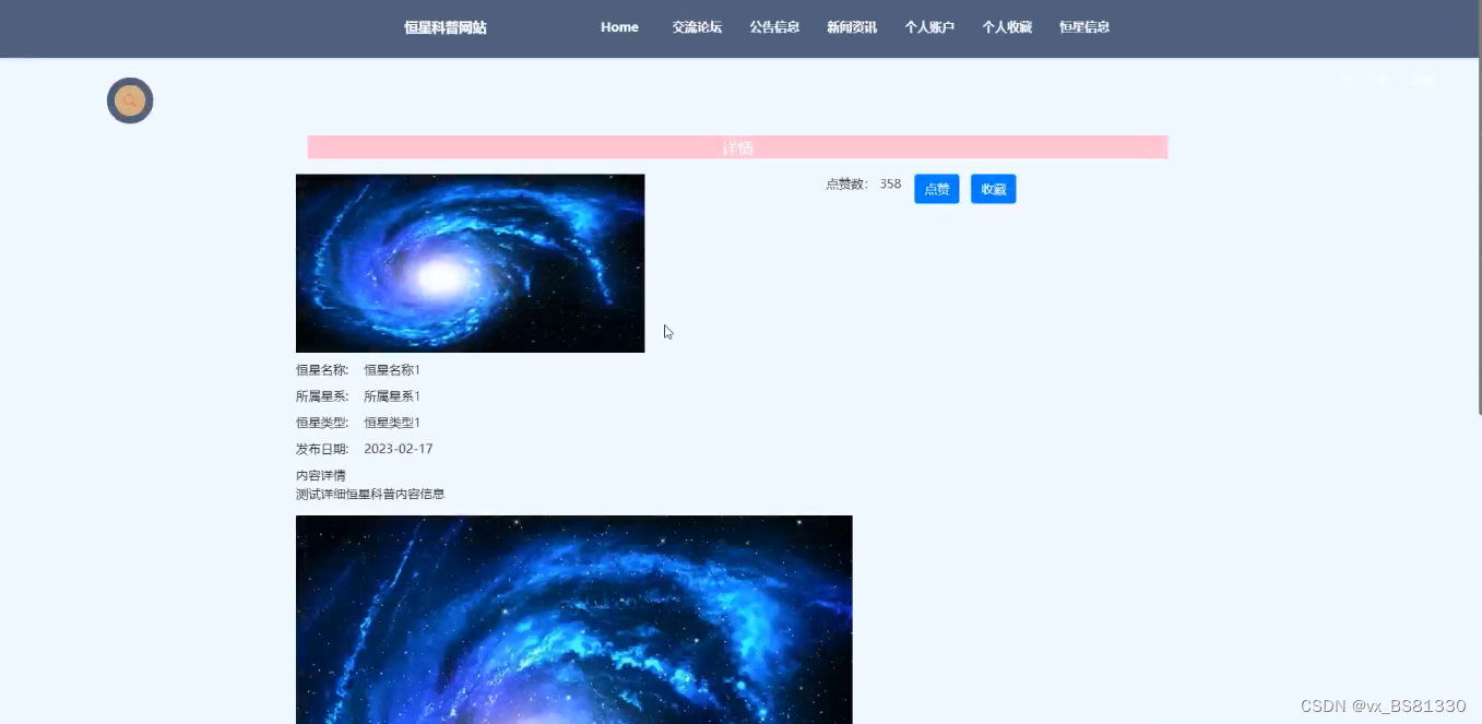 当访客点击了任意恒星信息后将会进入该恒星信息的详情界面,可以了解到该恒星信息的恒星名称、所属星系、恒星类型、发布日期、内容详情等,同时可以对该恒星信息进行点赞+收藏+评论,恒星信息详情展示页面如图4-6所示。