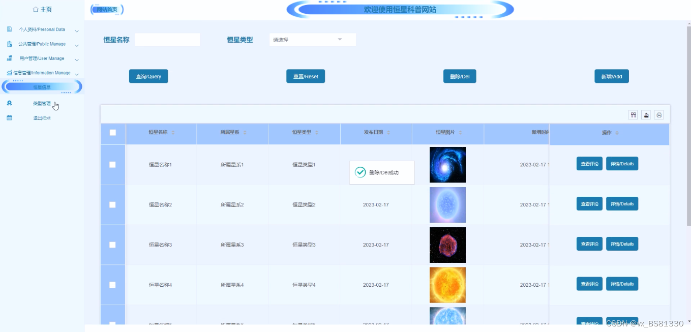 (6)恒星信息:管理员点击“恒星信息”会显示出所有的恒星信息,支持通过恒星名称或者所属星系或者恒星类型对恒星信息进行查询,如果想要添加新的恒星信息,点击“添加”按钮,输入相关信息,点击“提交”按钮就可以添加了,同时可以选择某一条恒星信息,点击“删除”进行删除,也可以对用户提交的评论的信息进行管控。