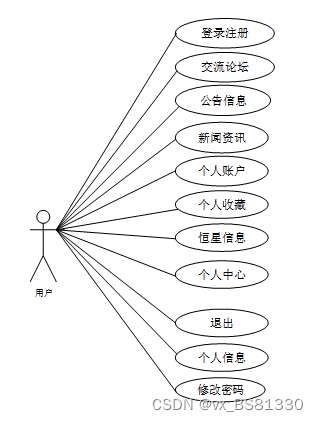 (3)确定好系统使用的技术,进行在线确认系统所划分的用户触,并且根据用户触划分确定所要设计的功能模块,对恒星科普网站的设计主要划分别为管理员和用户触,并所使用的功能模块也相应不同,但系统的数据库实现的内容是交互的,驴可以随时根据自己的需求进行健康食品信息搜索,对于系统工作人员可以根据自己的分管内容进行在线信息的处理及操作,管理员获取到所有用户的详细数据信息,并根据需求进行第一时间处理解决。
