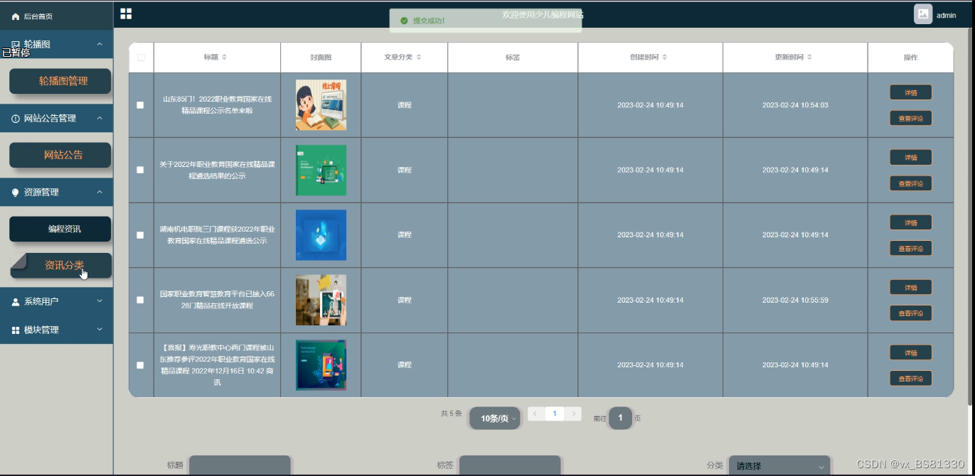 (2)公共管理:当点击“公共管理”这一菜单的时候,会出现轮播图以及公告信息这两个子菜单,可以对这两个模块进行增删改查操作;