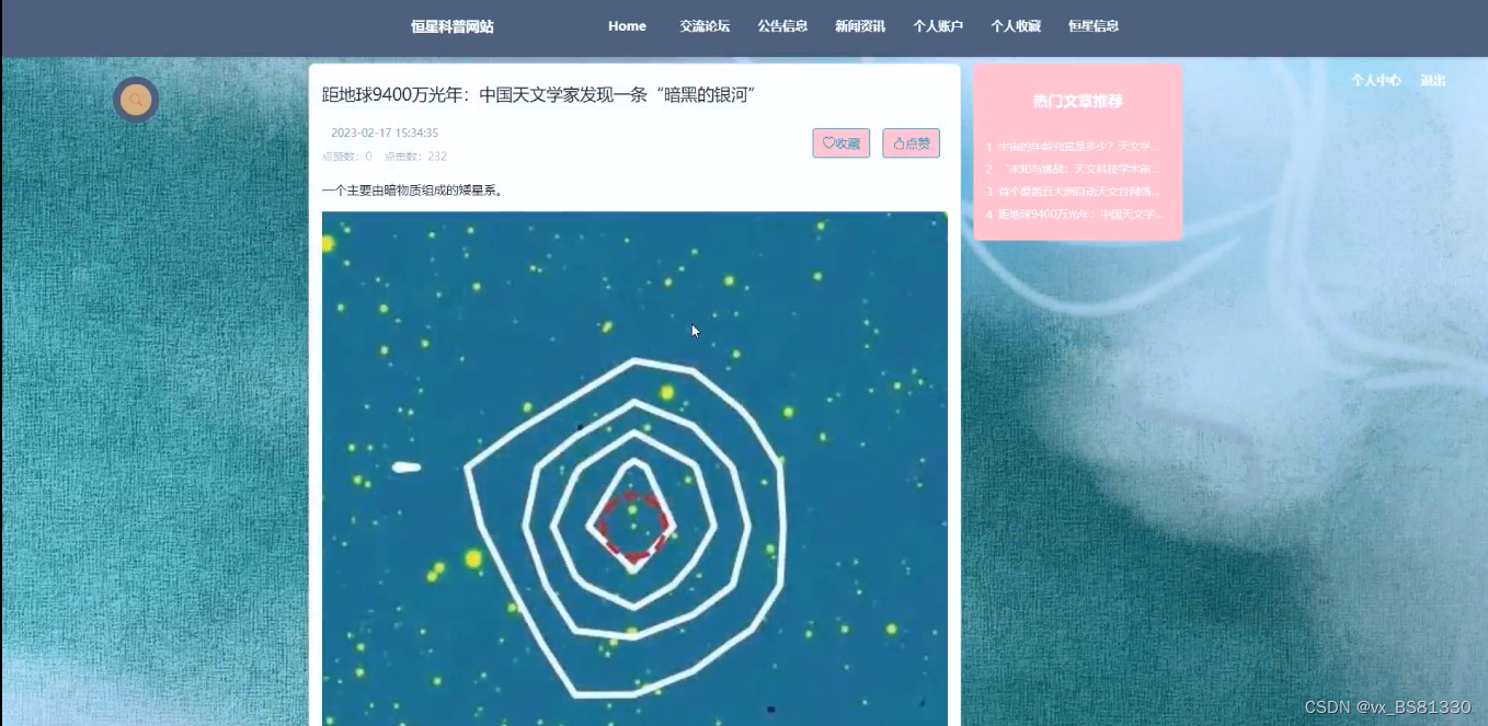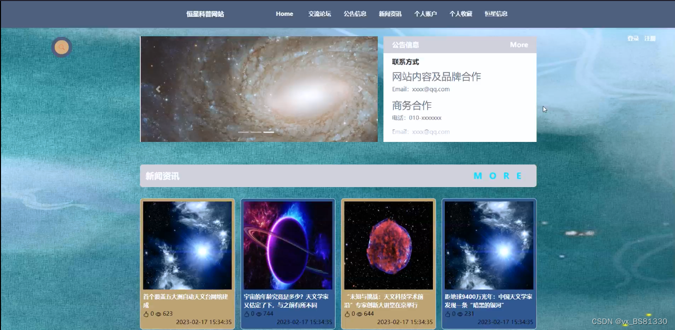 This design mainly realizes the star popular science website integrating the advantages of humanization, efficiency and convenience, and completes the functional modules of personal data, public management, user management, communication forum, forum classification, news information, news classification, star information, type management, etc. The system communicates with the server through the browser to realize data interaction and change. You can operate the system by moving your fingers through a computer to realize data communication management. The design process of the whole system fully considers the safety, stability and reliability of data, and the operation process is simple. The system improves work efficiency and reduces errors and omissions in data storage through scientific management and convenient services.