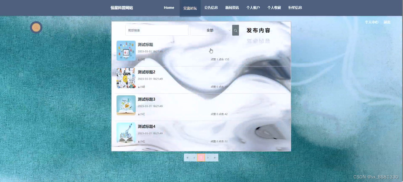 用户在点击导航栏上面的交流论坛后,就可以搜索查看论坛信息,用户根据自己的喜好可以进行交流,交流论坛界面如下图4-7所示。