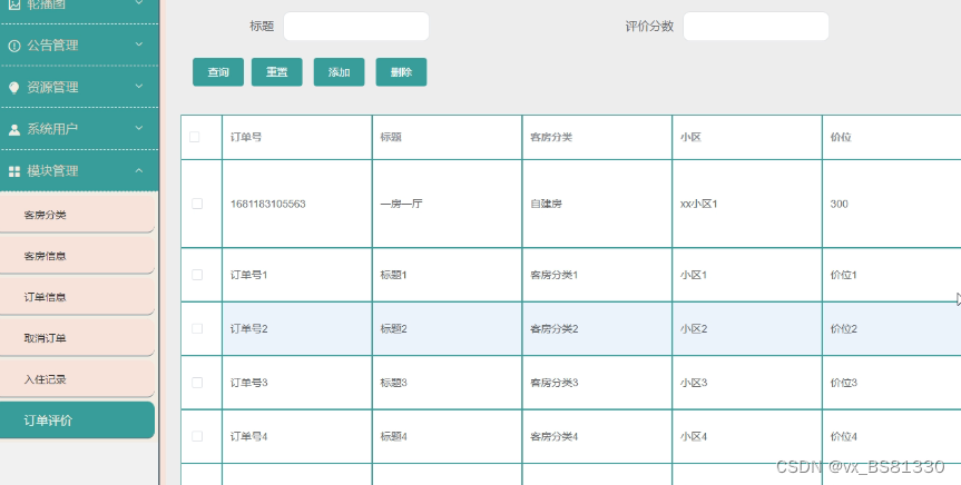 模块管理:管理客房信息,客房分类,订单信息,取消订单,入住记录,订单评价信息数据等。