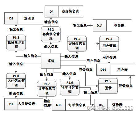 二层数据流程是对一层数据流层图中填写登录注册信息、用户功能的细化。即:填写登录注册信息细化为填制信息、后台审核,用户功能细化为浏览租房资讯、客房信息、入住信息等操作。