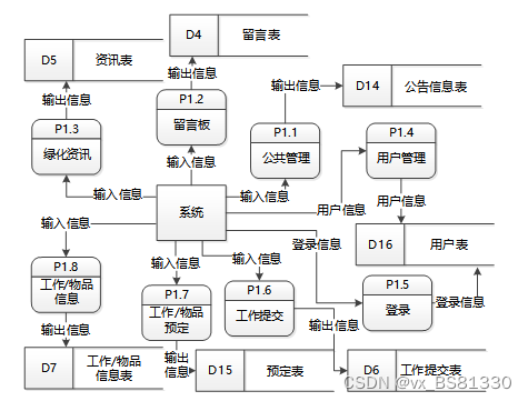 二层数据流程是对一层数据流层图中填写登录信息、用户功能的细化。即:用户管理,信息管理,工作信息,工作预定,工作提交,物品信息,物品预定,清点记录查询等操作。