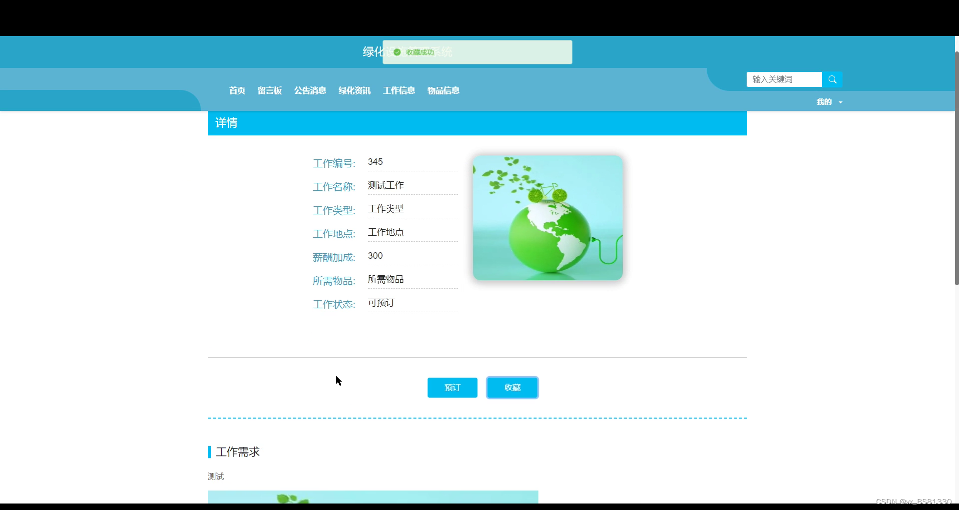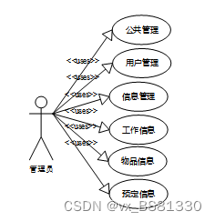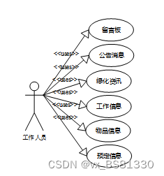 系统设计的目的是分析系统包括的所有功能结构,为开发人员设计开发和实现系统做好准备工作。经过前期的需求调查、分析和整理之后,确定的总体需求主要包括多个模块,分别是:公共管理(轮播图,公告消息),用户管理(管理员,工作人员),信息管理(留言板,留言分类,绿化资讯,资讯分类),工作信息,工作预定,工作提交,物品信息,物品预定)等。系统整体角色分为两个部分,一是工作人员、二是管理员。权限分布也是很明显,工作人员是在除去浏览信息之外还具有查询和管理自己账户信息,工作信息,物品信息,工作预定,工作提交,物品预定,清点记录等权限;管理员是最高权限拥有者。