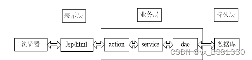 页面发送请求给控制器,控制器调用业务层处理逻辑,逻辑层向持久层发送请求,持久层与数据库交互,后将结果返回给业务层,业务层将处理逻辑发送给控制器,控制器再调用视图展现数据。