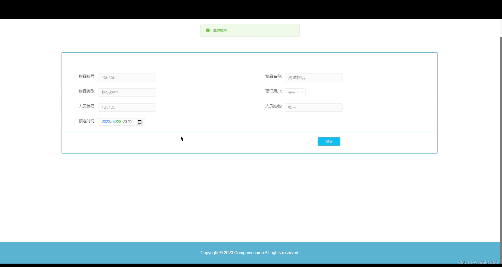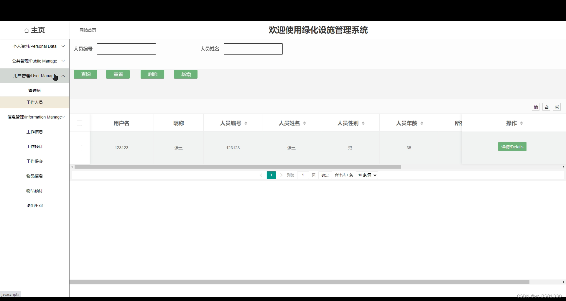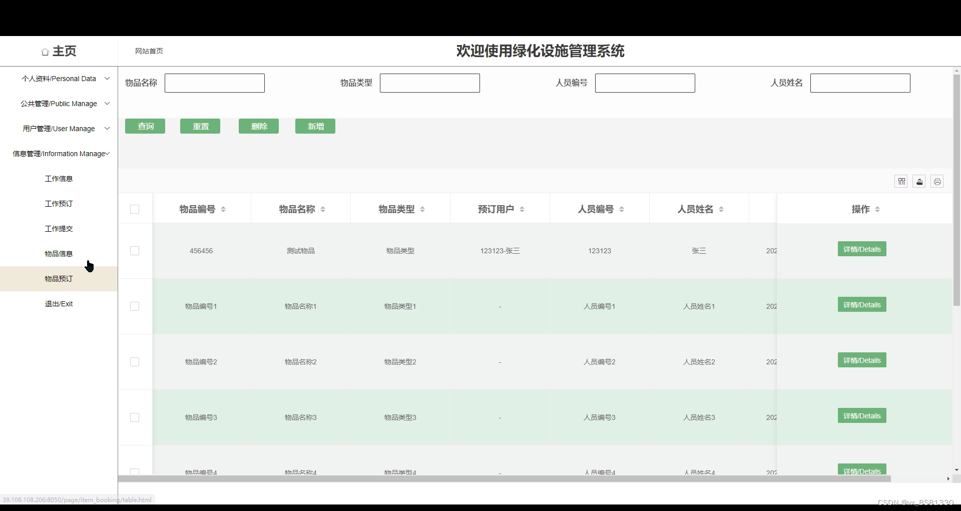 管理员在此页面可以查看物品编号,名称,类型,预定用户,人员编号等物品详细信息。可以进行查询,重置,删除,新增等操作。如下所示。
