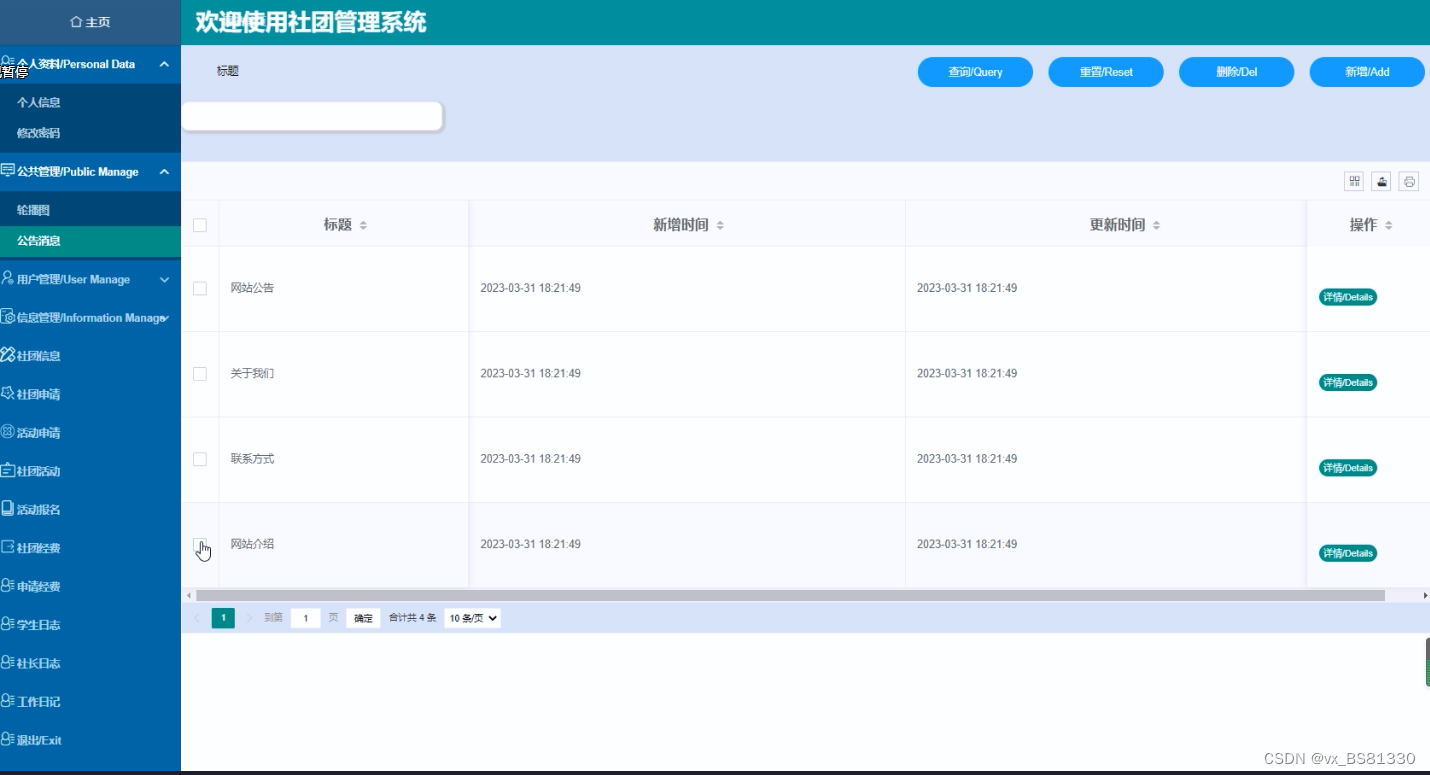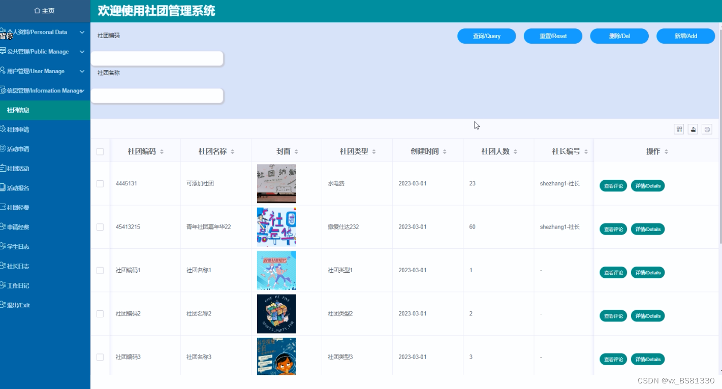 社团信息管理界面如下图所示。
