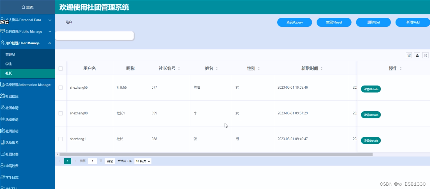 (2)成员日志:社长点击“成员日志”这一菜单,可以查看到自己社团里面的成员的信息,可以对社团成员进行增删改查操作。