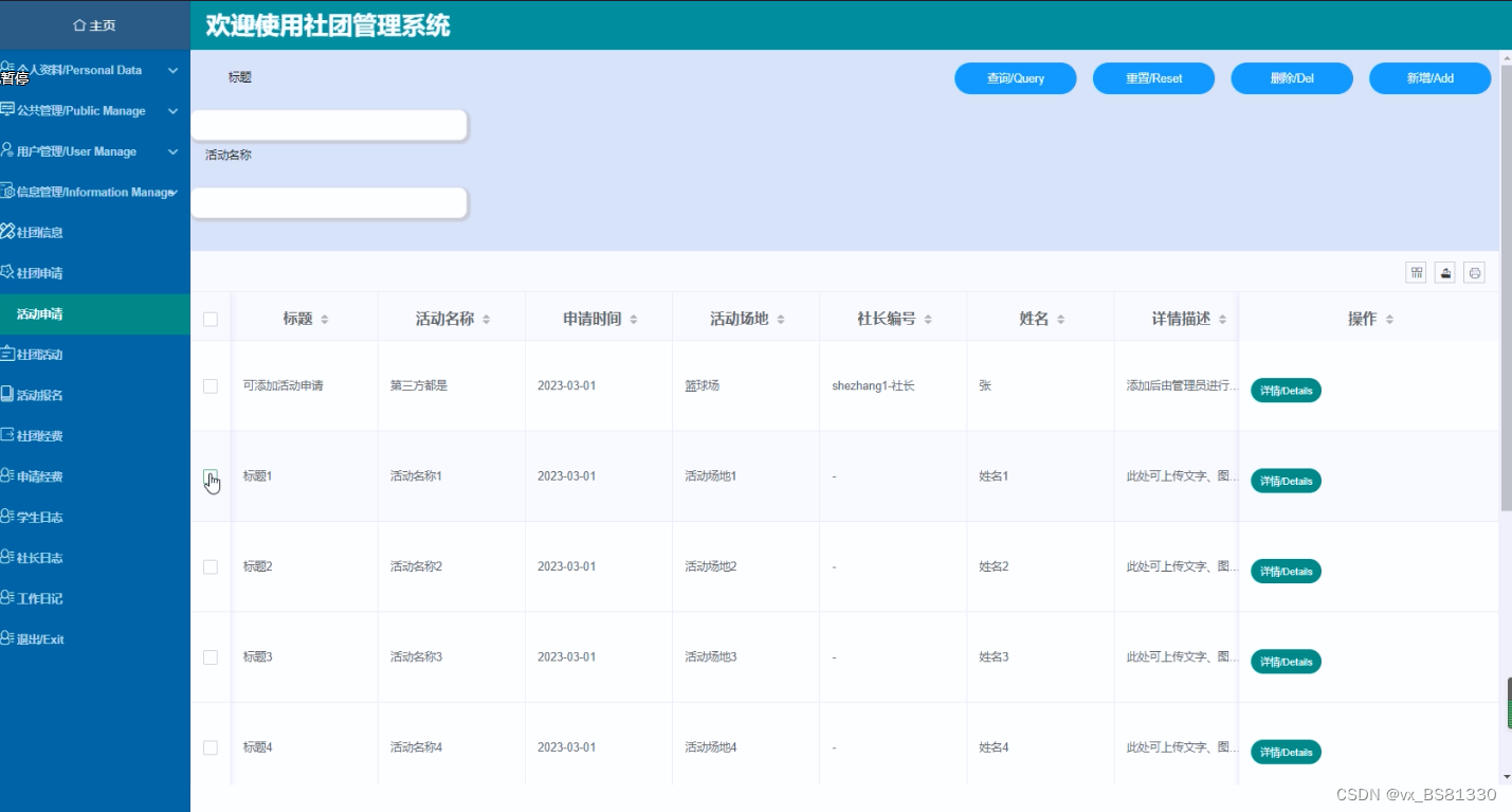 (1)活动申请:社长点击“活动申请”这一菜单,能够查看到自己提交的活动申请信息,可以添加+编辑+删除+查询活动申请信息。