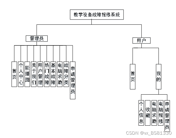 系统架构图属于系统设计阶段,系统架构图只是这个阶段一个产物,系统的总体架构决定了整个系统的模式,是系统的基础。基于教学设备故障报修系统的整体结构设计如图4-2所示。