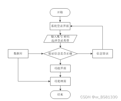用户想进入系统,首先进入系统登录界面,通过正确的用户名、密码,选择登录类型登录,系统会检查登录信息,信息正确,然后输入相应的功能界面,提示信息错误,登录失败。系统操作流程如图3-4所示。