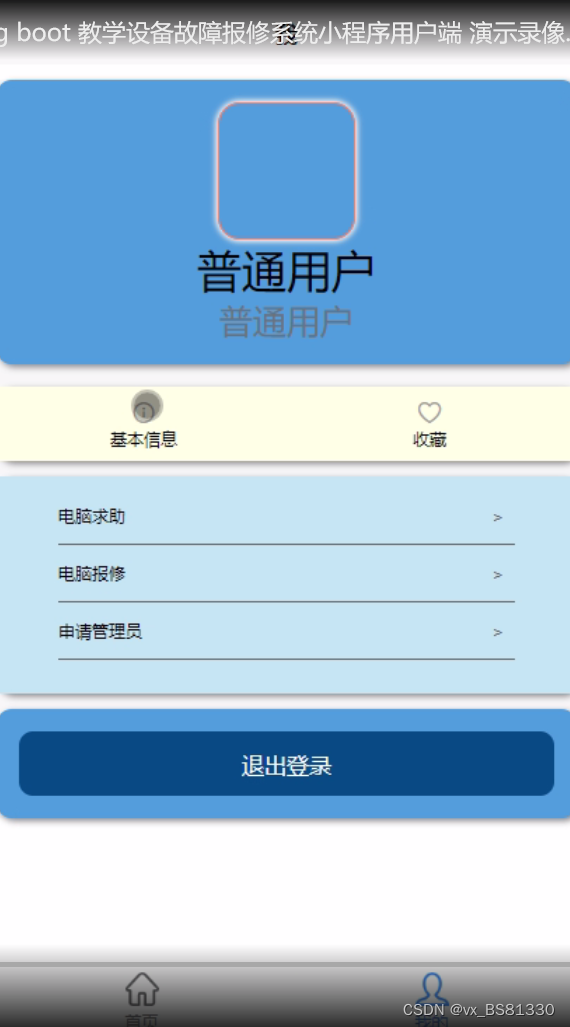对于教学设备故障报修系统的设计来说,它主要是采用后台采用java语言、springboot框架,它是应用mysql数据库、微信小程序等技术动态编程以及数据库进行努力学习和大量实践,并运用到了微信小程序的建设中在整个系统的设计当中,具体根据教学设备故障报修系统的现状来进行开发的,具体根据用户需求实现教学设备故障报修系统网络化的管理,各类信息有序地进行存储,进入教学设备故障报修系统页面之后,方可开始操作主控界面,系统功能包括管理员服务端:首页、网站管理(轮播图、关于我们)人员管理(管理员、普通用户)模块管理(热门故障、基本故障、电脑求助、电脑报修、故障分类、申请管理员)个人管理;用户客户端:首页、我的(个人信息、收藏、电脑求助、电脑报修、申请管理员)等功能。