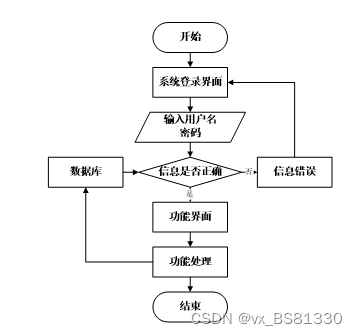 用户打开客户端并进入系统后,会先显示登录界面,输入正确的用户名和密码,系统自动检测信息,若信息无误,则用户会进入系统功能界面,进行操作,否则会提示错误无法登录,操作流程如图3-3所示。