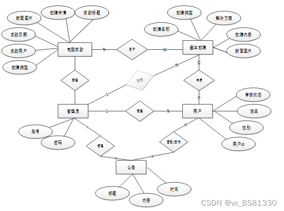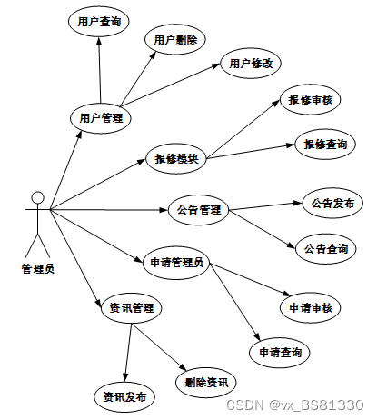 3.管理员主要负责首页、网站管理(轮播图、关于我们)人员管理(管理员、普通用户)模块管理(热门故障、基本故障、电脑求助、电脑报修、故障分类、申请管理员)个人管理,下图所示描述管理员的用例图。