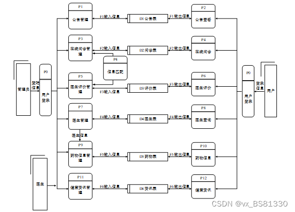 对系统的数据流进行分析,系统的使用者分为二类,一般用户(患者、医生),管理员。系统主要对界面信息传送,登录信息的验证,注册信息的接收,用户各种操作的响应做处理。
