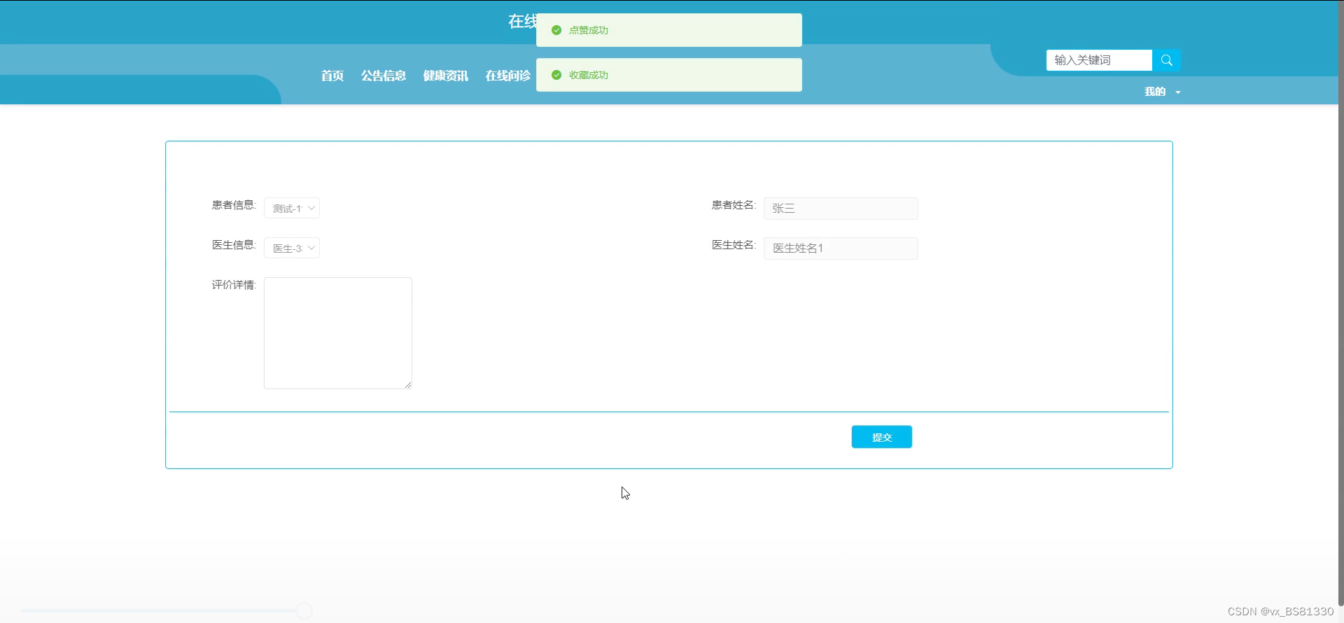 在线问诊:用户可以在在线问诊页面搜索医生或科室信息,浏览医生的详细信息,