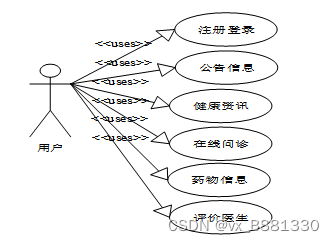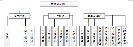 在线问诊系统的功能主要分为前台用户根据自己的需求进行注册登录,浏览医生信息并对选中的医生进行在线操作。后台系统管理员因职责的不同,分为医生和管理员,医生主要对问诊信息订单进行处理,而管理员主要对注册用户,健康资讯、科室管理、在线问诊、问诊信息、药物信息等进行管理。