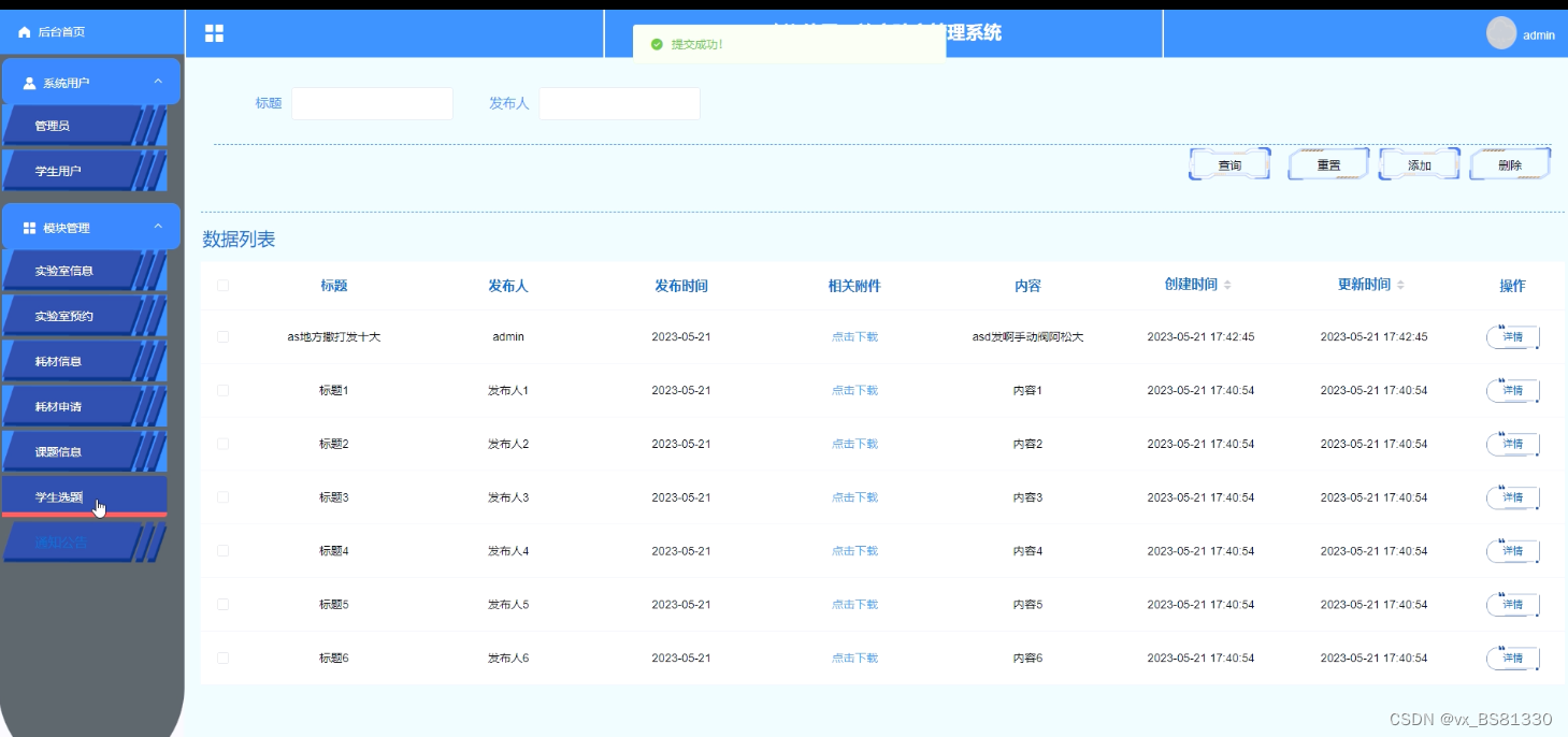 开放实验室管理系统在系统的平台上可以运行,主要实现了管理员后端;首页、系统用户(管理员、学生用户)模块管理(实验室信息、实验室预约、耗材信息、耗材申请、课题信息、学生选题、通知公告);学生用户功能;首页、实验室信息、耗材信息、耗材申请、课题信息、学生选题、通知公告管理模块的操作和管理。