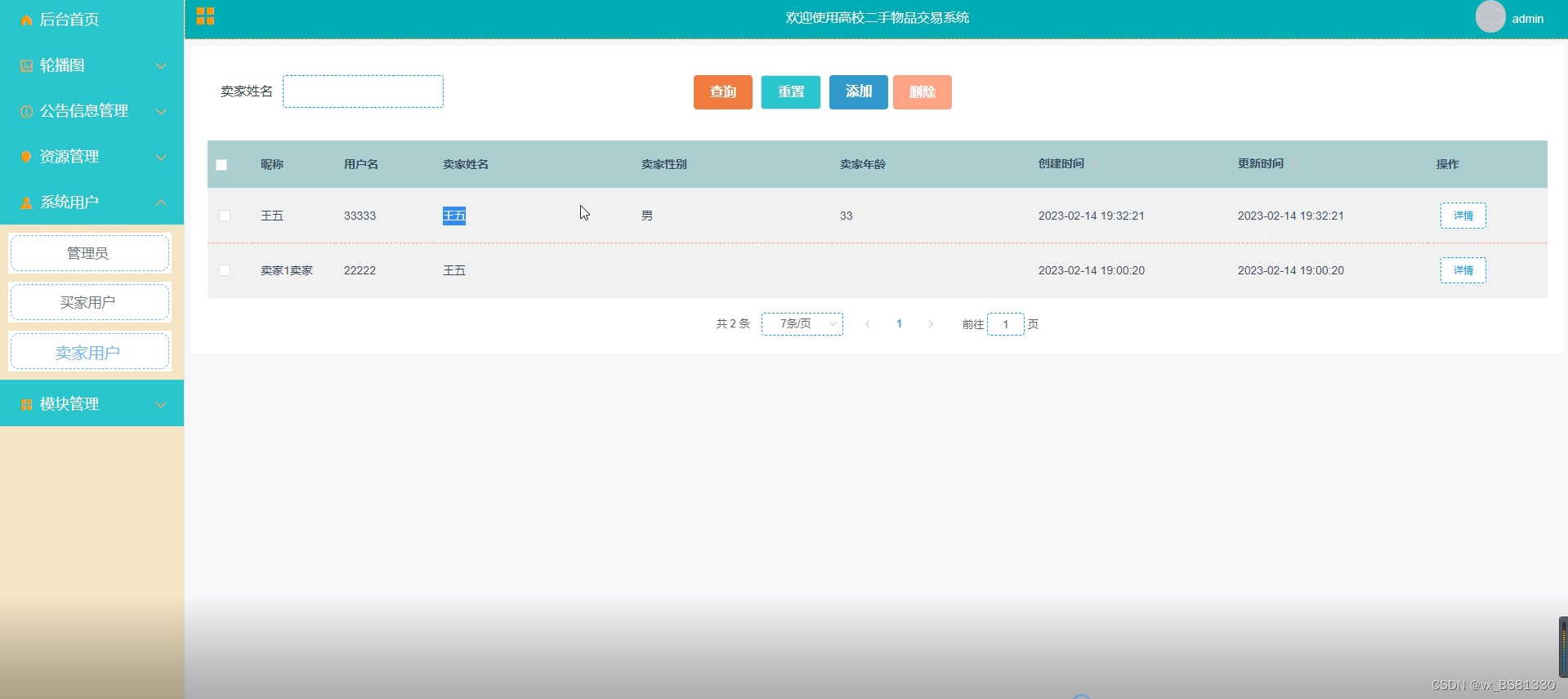 (3)用户管理:管理员可以对高校二手物品交易系统中的管理员,卖家以及前台注册的买家进行增删改查。