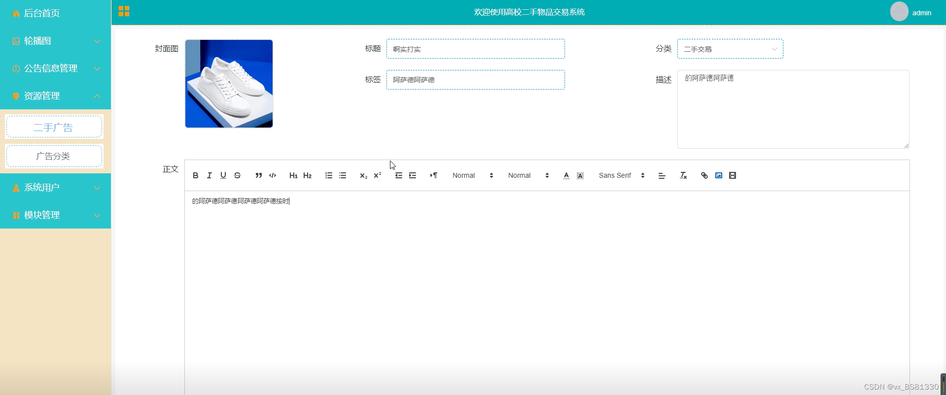 (2)二手广告管理:管理员在后台可以对高校二手物品交易系统中显示的二手广告进行增删改查。