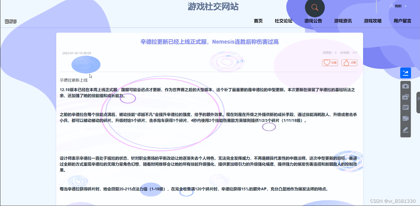 (4)游戏资讯:在首页导航栏上我们会看到“游戏资讯”这一菜单,我们点击进入进去以后,会看到所有管理员在后台发布的游戏资讯信息,能够对喜欢的游戏资讯进行点赞,如果下次想要更快的找到这篇资讯,也可以进行收藏、评论;