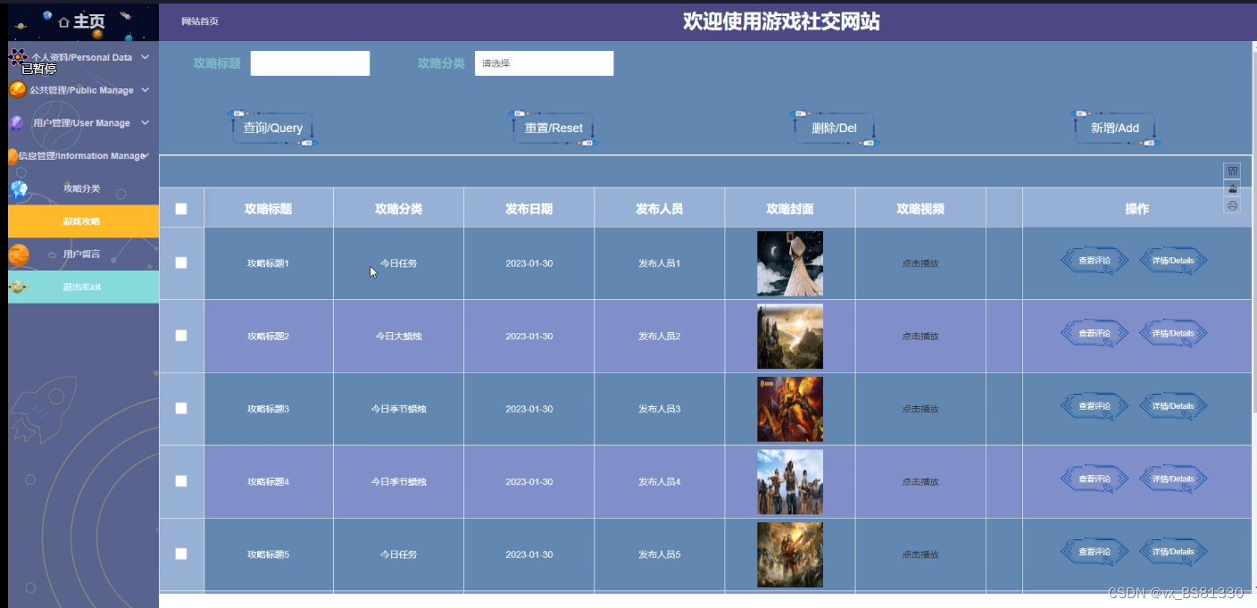 (6)游戏攻略:点击“游戏攻略”这个按钮可以查看到所有游戏攻略信息,支持通过攻略标题或者攻略分类或者发布日期进行查询游戏攻略信息,可以对游戏攻略进行添加、删除、查看游戏攻略信息的详细内容;