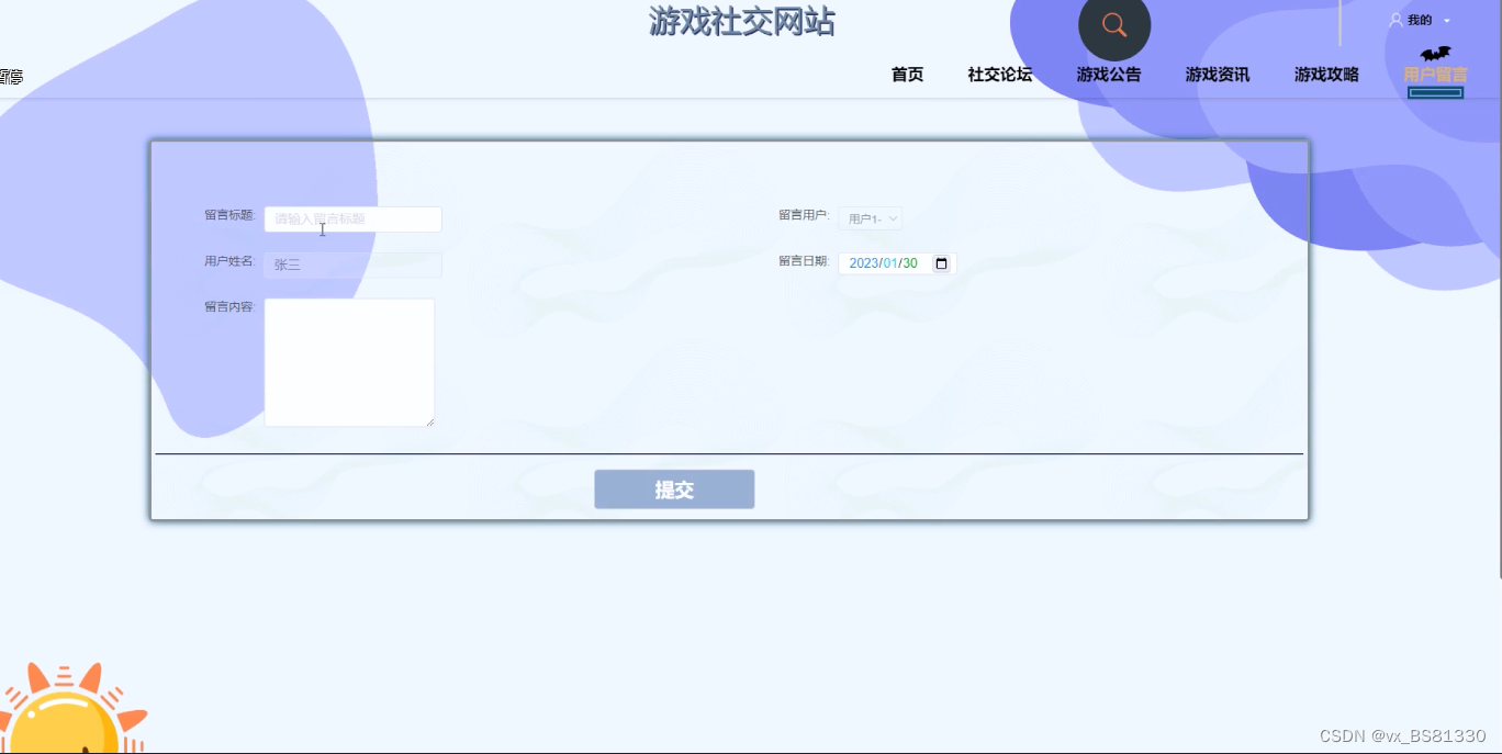 点击导航栏上的“用户留言”,可以选择留言类型,留言标题、留言内容、用户姓名、留言用户、留言日期,然后点击“提交”按钮进行提交用户留言,用户留言界面如下图4-5所示。