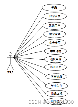 (1)管理员模块:系统中的核心用户是系统管理员,管理员登录后,通过管理员菜单来管理系统。主要功能有:首页、系统用户(管理员、学生)模块管理(宿舍管理、宿舍费用、学生退宿、违例信息、违规申诉、宿舍物品、学生入住、物品上报、出入登记)等功能。管理员用例图如图3-1所示。