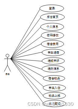(2)学生:宿舍费用、学生退宿、违例信息、违规申诉、宿舍物品、学生入住、物品上报、出入登记等功能。学生用例如图3-2所示。