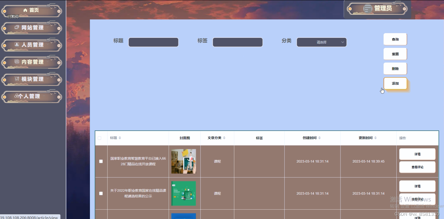 (1)网站管理:管理员可以对学生用户端展示的轮播图以及公告进行增删改查,方便用户进行查看。