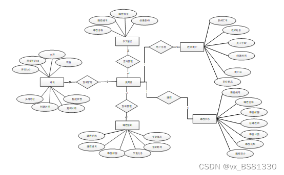 下面是整个计算机课程教学辅助系统小程序中主要的数据库表总E-R实体关系图。