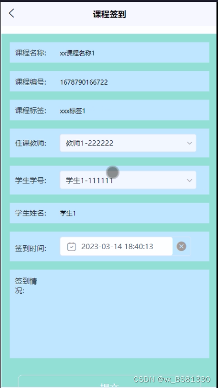 (6)课程签到:点击“课程签到”后跳转到课程签到提交界面,选择签到情况,输入课程名称、课程编号、课程标签、任课教师、学生学号、学生姓名、签到时间,然后点击提交课程签到就完成了。