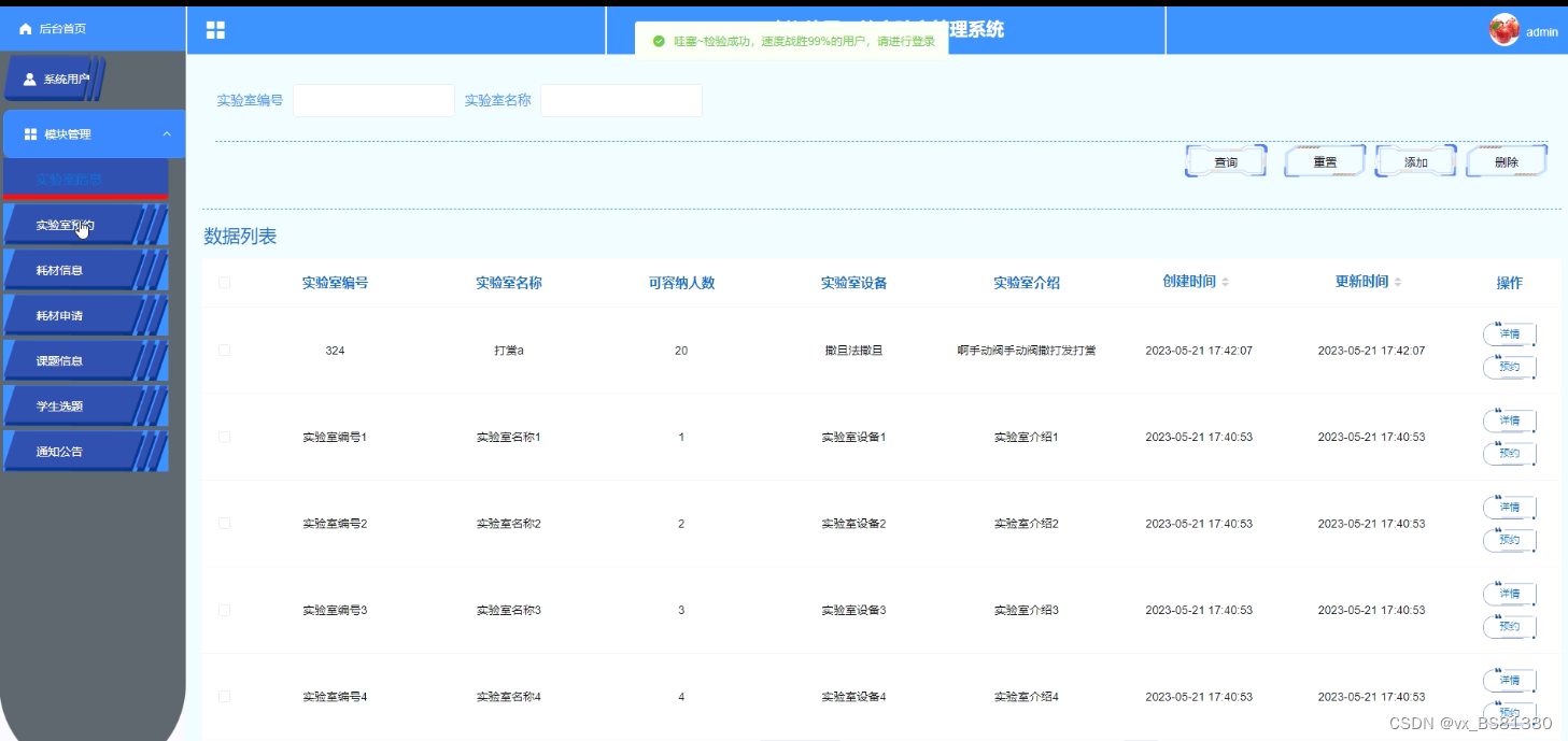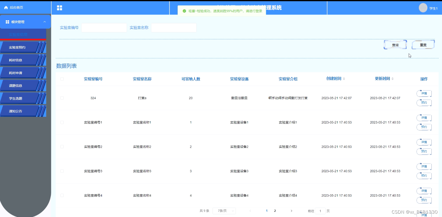开放实验室管理系统在系统的平台上可以运行,主要实现了管理员后端;首页、系统用户(管理员、学生用户)模块管理(实验室信息、实验室预约、耗材信息、耗材申请、课题信息、学生选题、通知公告);学生用户功能;首页、实验室信息、耗材信息、耗材申请、课题信息、学生选题、通知公告管理模块的操作和管理。