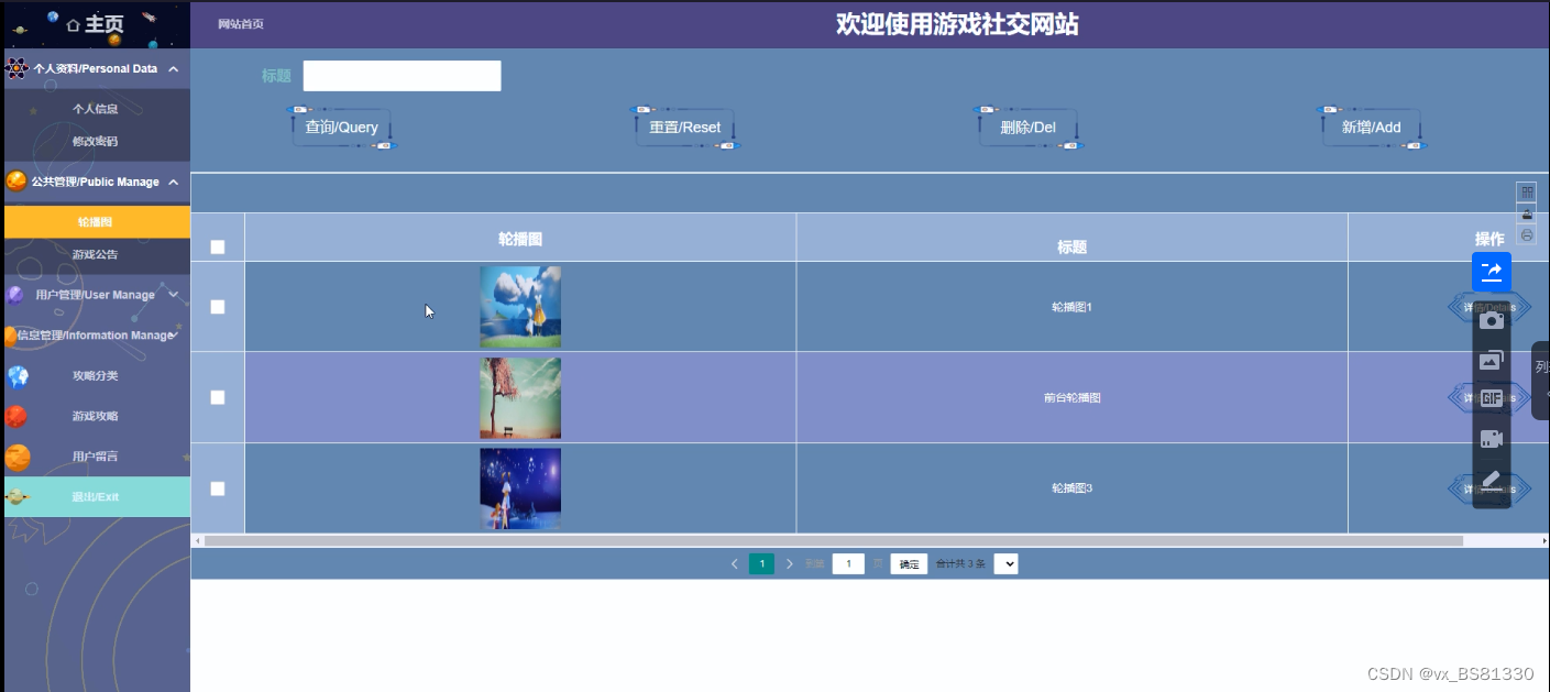 (2)公共管理:当点击“公共管理”这一菜单的时候,会出现游戏公告+轮播图这两个子菜单,可以对这两个模块进行增删改查操作;