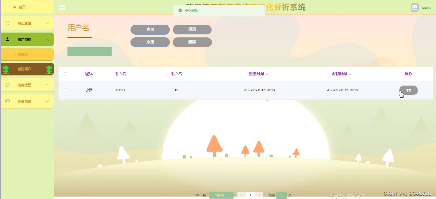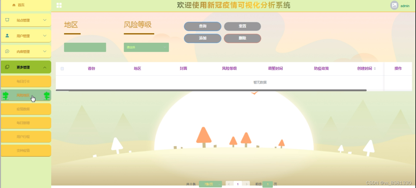 管理员登录进入新冠疫情可视化分析系统 可以查看后台首页、站点管理(轮播图、公告栏)、用户管理(管理员、系统用户)、内容管理(疫情舆情、舆情分类)、更多管理(每日打卡、风险地区、疫情数据、每日新增、用户行程、变种疫情)等信息,如图5-2所示。
