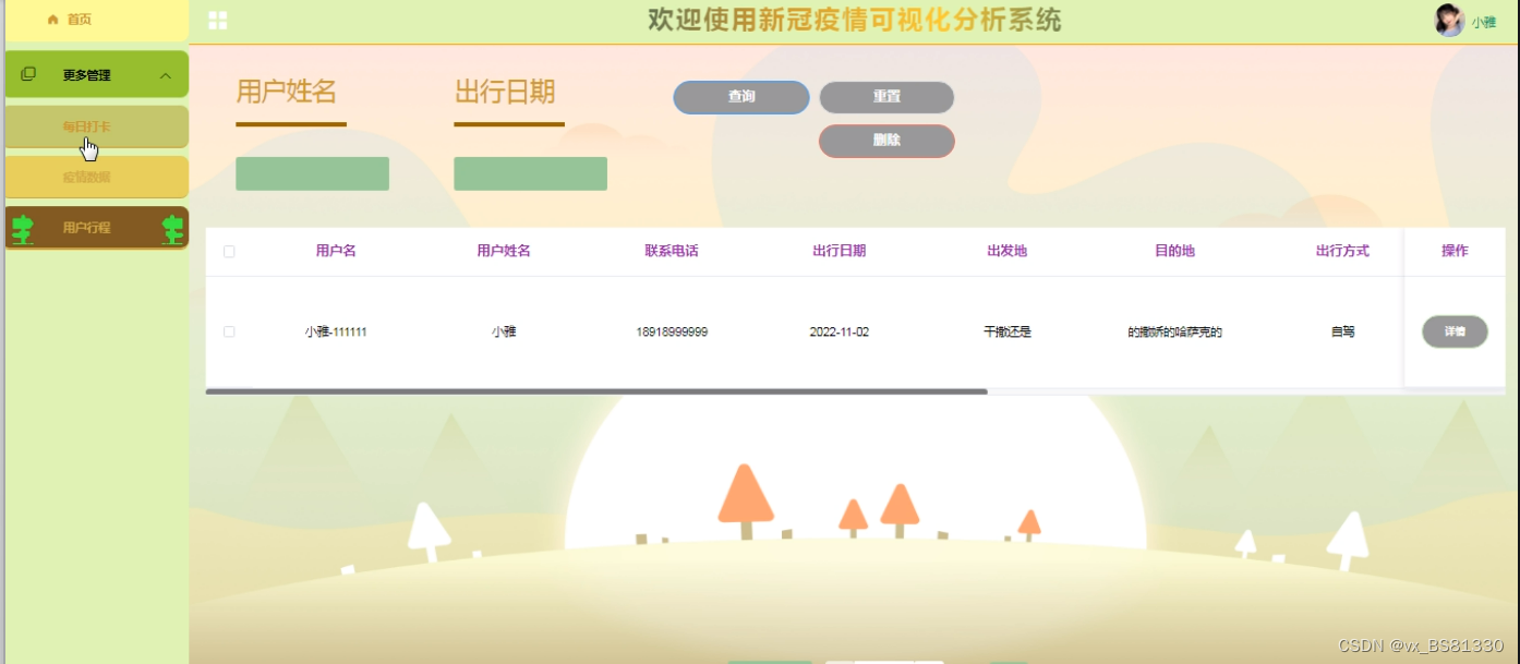 用户登录进入新冠疫情可视化分析系统 可以查看后台首页、个人中心、更多管理(每日打卡、疫情数据、用户行程)等信息,如图5-9所示。