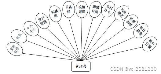 (1)管理员模块:系统中的核心用户是系统管理员,管理员登录后,通过管理员菜单来管理后台系统。主要功能有:首页、站点管理(轮播图、公告栏)、用户管理(管理员、系统用户)、内容管理(疫情舆情、舆情分类)、更多管理(每日打卡、风险地区、疫情数据、每日新增、用户行程、变种疫情)等功能。管理员用例图如图3-1所示。