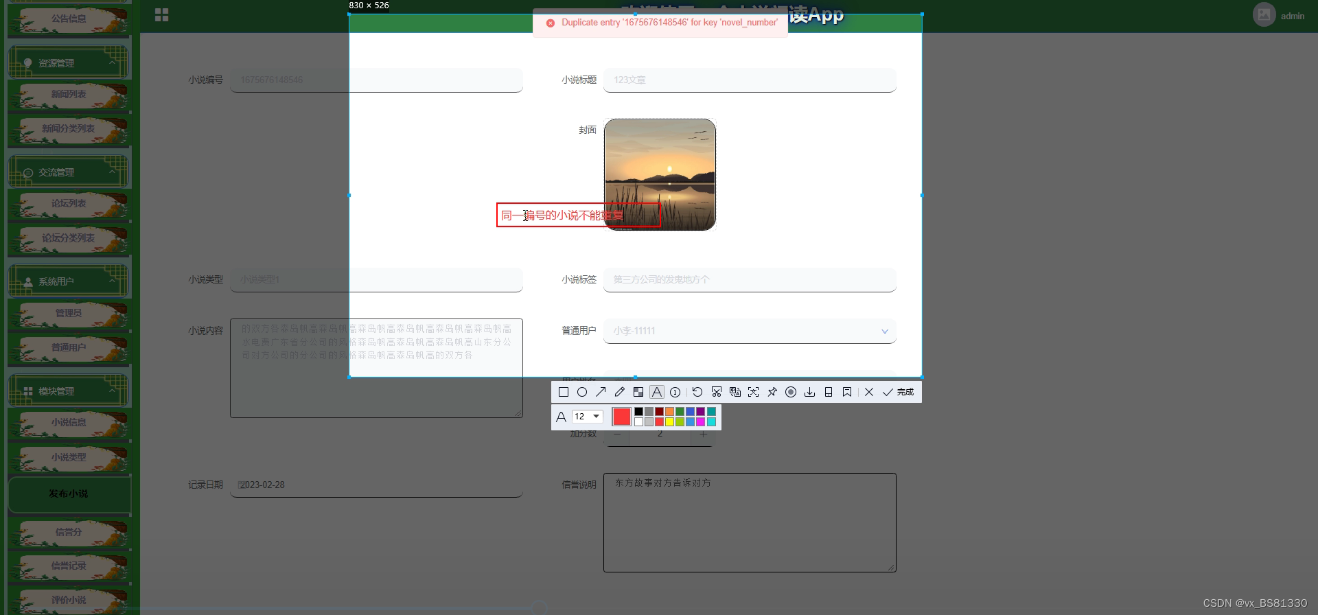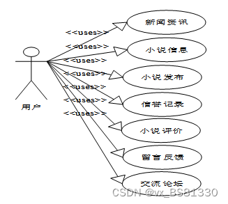 用户模块:小说浏览、公告栏、发布小说、信誉编辑、小说信息、留言反馈、小说点赞收藏等。