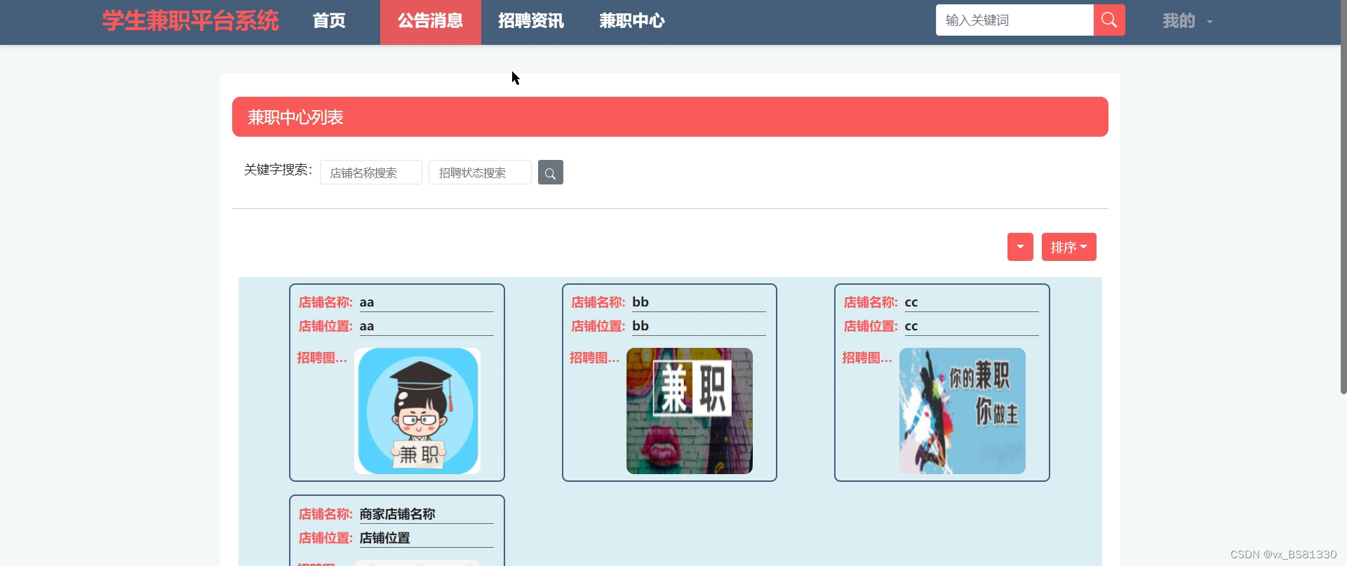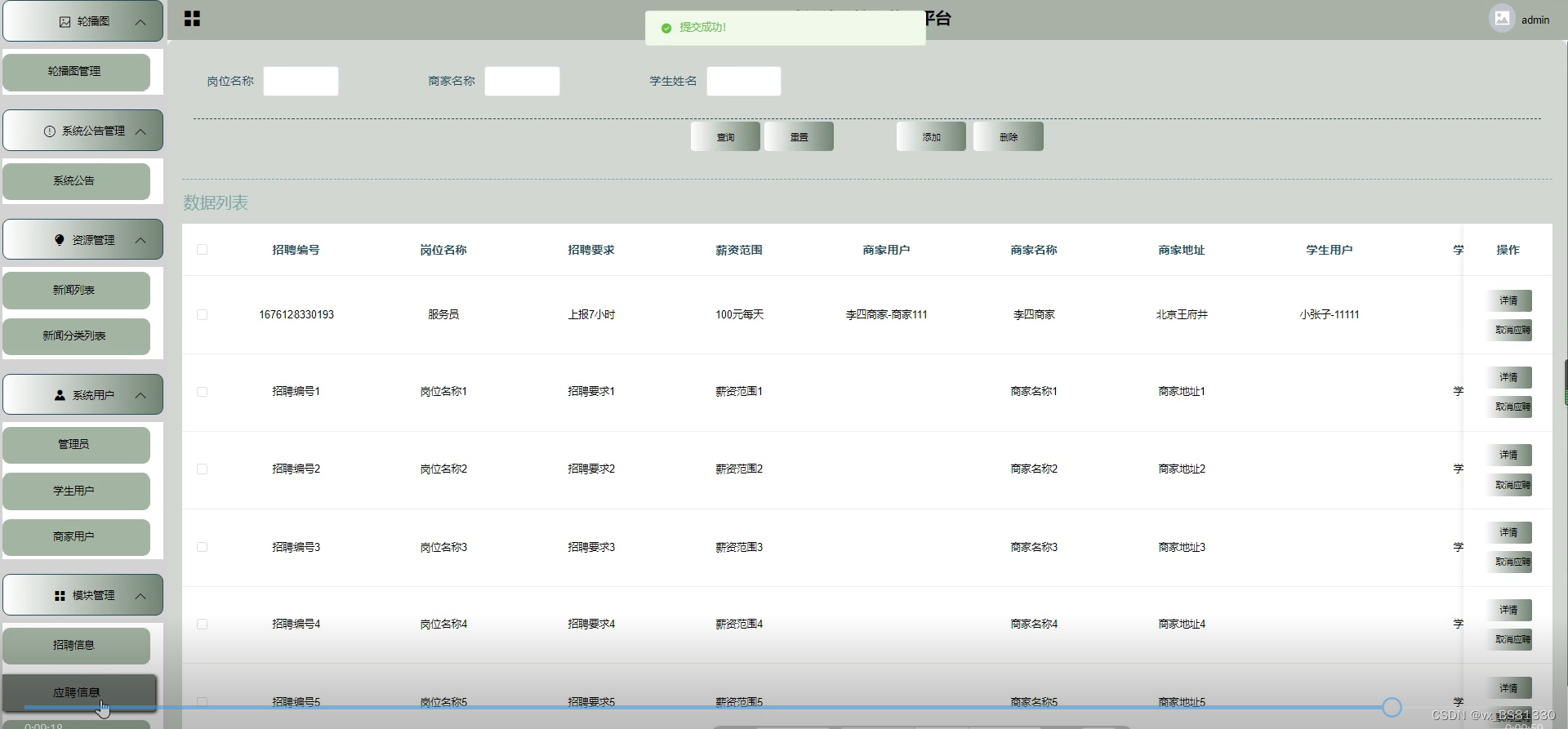 应聘信息管理:商家可以查看到学生提交的应聘信息。