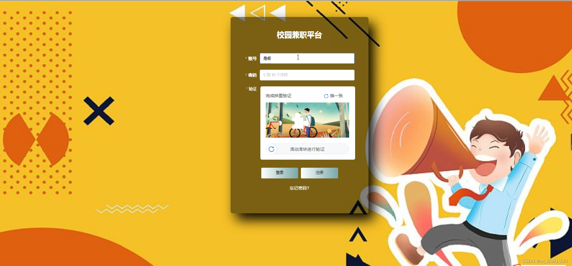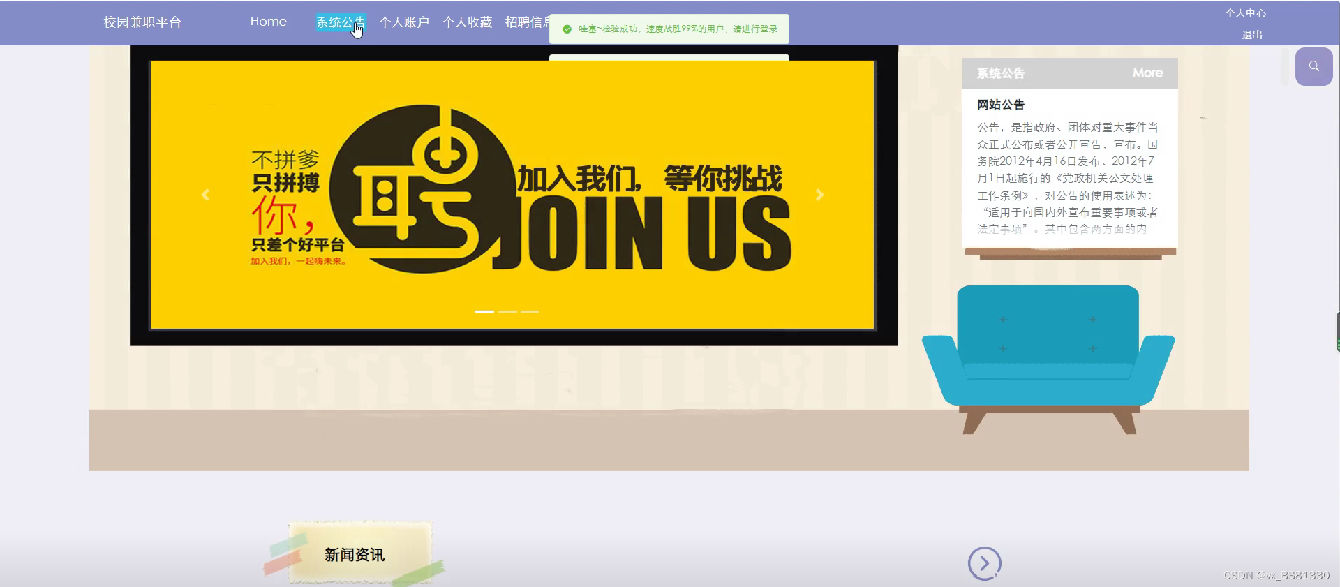 The main functional modules of the campus part-time platform include user management, recruitment information management, recruitment information, part-time center, etc. The object-oriented development model is adopted for software development and hardware installation, which can well meet the actual use needs, improve the corresponding software framework and program coding, and use the Springboot framework, JSP technology, Ajax technology to code and develop the business system, Complete the page design and function realization of the main modules of the system. This report first analyzes the background, role and significance of the research, laying a foundation for the rationality of the research work. This paper analyzes the requirements and technical problems of the campus part-time platform, proves the necessity and technical feasibility of the system, and then makes a basic introduction to the technical software and design ideas needed to design the system, and finally realizes the deployment and operation of the campus part-time platform.