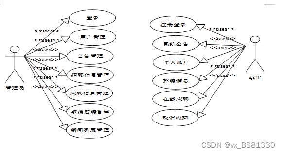 应聘管理模块:管理员对学生的应聘信息进行维护管理。应聘信息由学生进行提交删除操作。