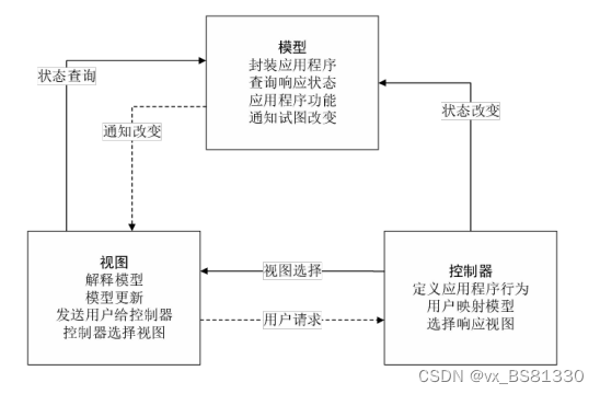 控制器(Controller)可以理解为接收用户的请求,然后视图和模型匹配在一起,一起再完成用户请求。它有非常明显的作用在划分控制层上,可以很清晰地告诉你,它就是一个分发器,选择什么样的模型、视图,可以完成用户的什么样的请求。控制层不做所有的数据处理,比如说:用户点击一个连接,控制层接受到请求之后,并不处理业务信息,它只是向模型传递用户的信息,同时告诉模型做什么,然后选择符合需求的视图返回给用户。