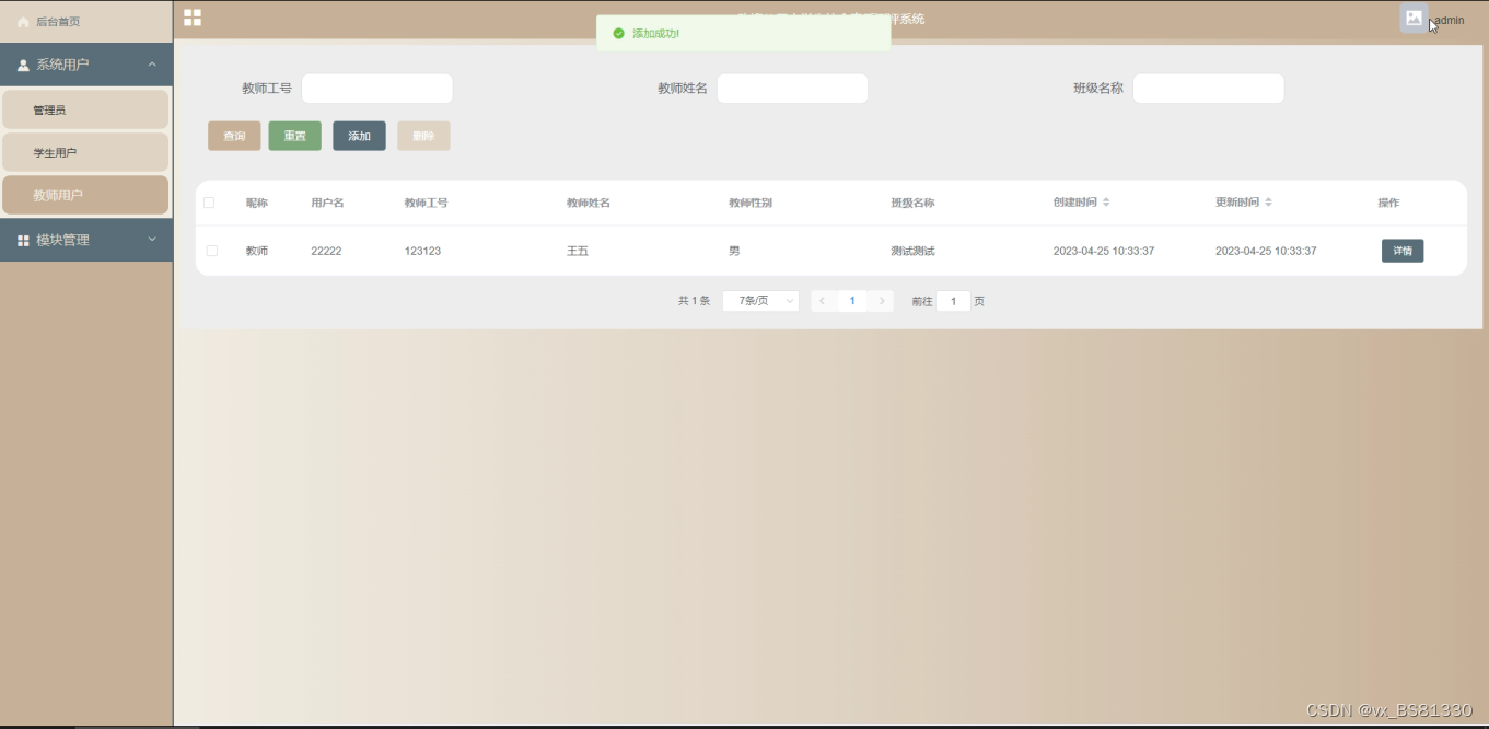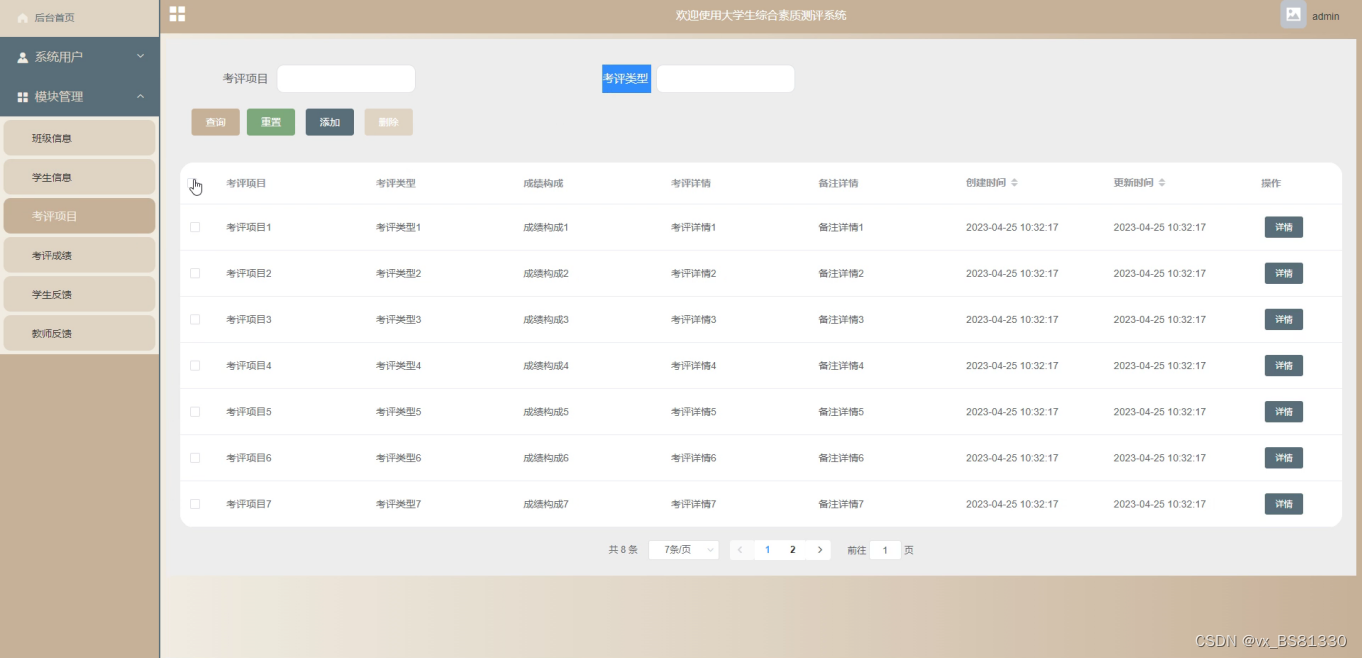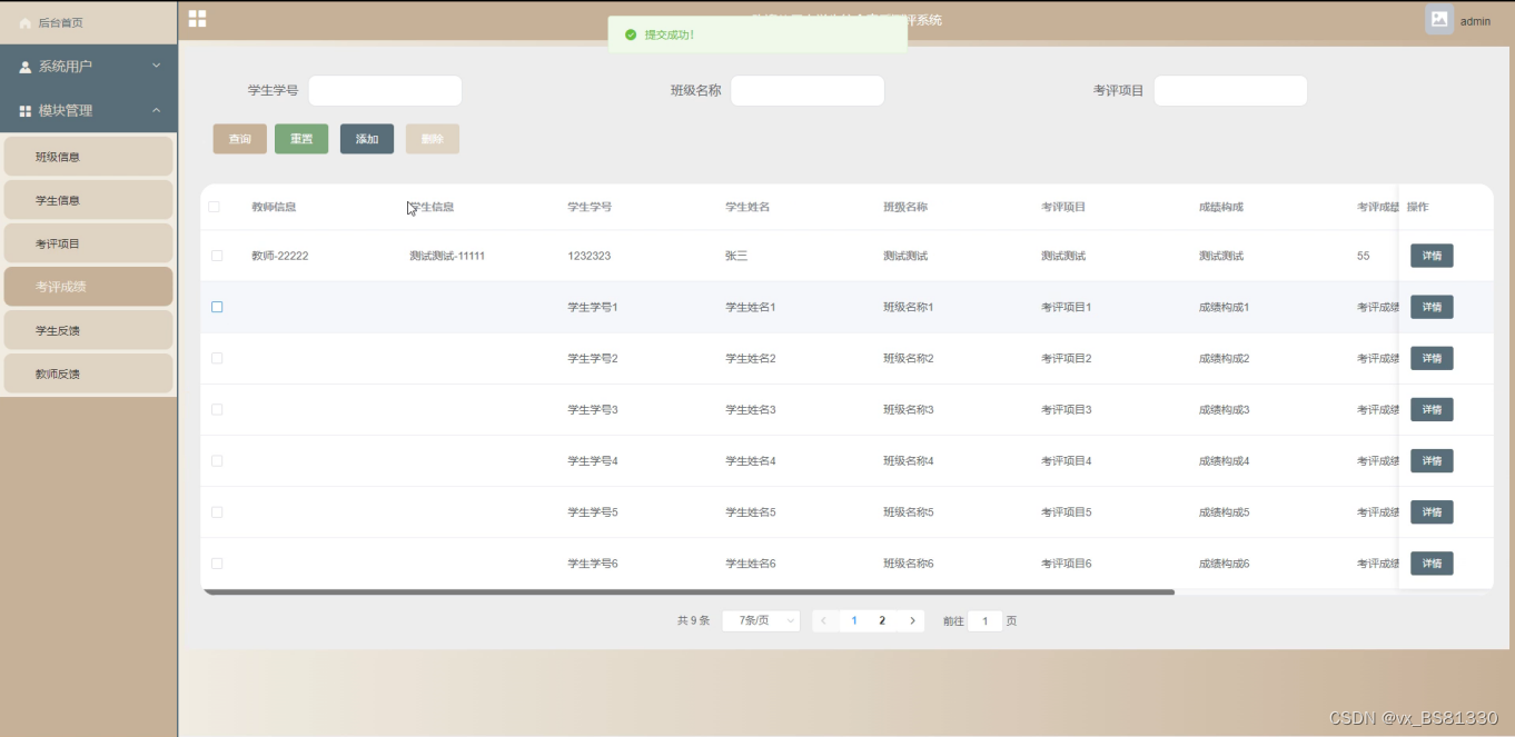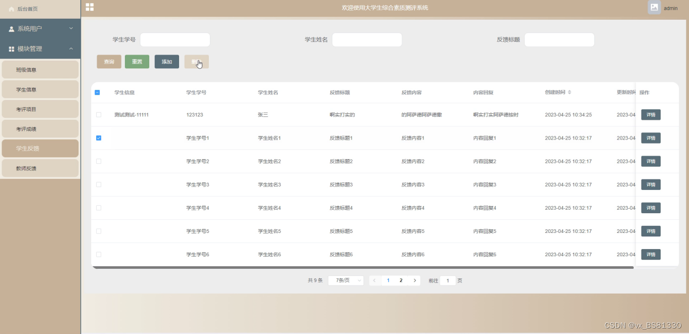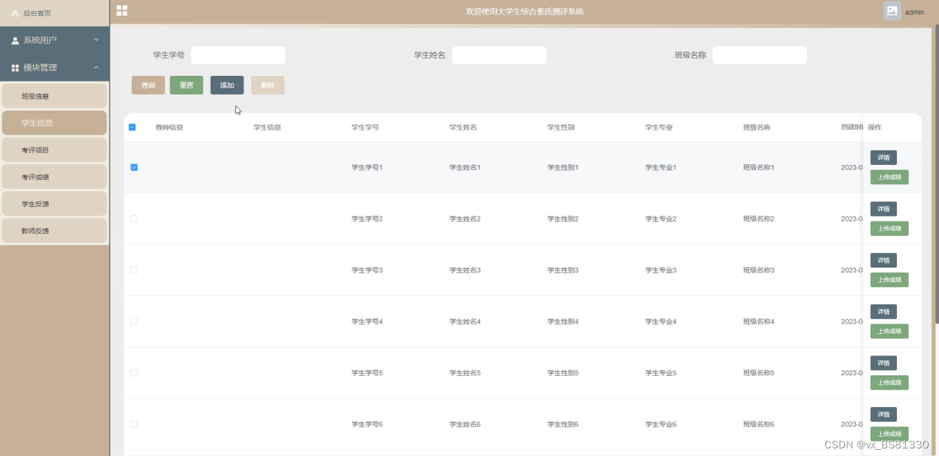 The main users of the comprehensive quality evaluation system for college students are divided into administrators and users, with functions including: homepage, system user management (administrators, student users, teacher users), module management (class information, candidate information, evaluation items, evaluation scores, student feedback, teacher feedback). Due to the comprehensive design of the functional modules in this system, the entire process of evaluating the comprehensive quality of college students has been improved.
