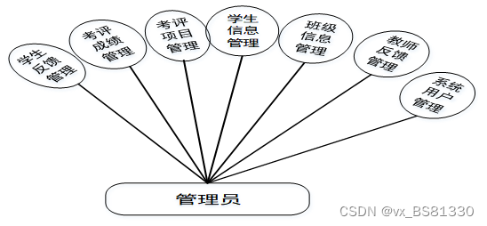 (1)管理员模块:系统中的核心用户是系统管理员,管理员登录后,通过管理员菜单来管理后台系统。主要功能有:首页、系统用户管理(管理员、学生用户、教师用户)、模块管理(班级信息、考生信息、考评项目、考评成绩、学生反馈、教师反馈)等功能。管理员用例图如图3-1所示。