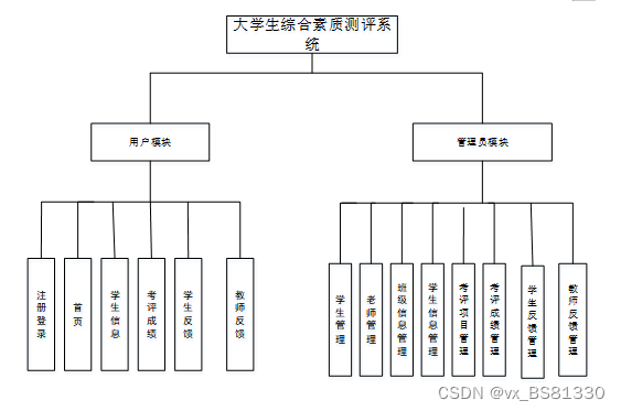 本大学生综合素质测评系统主要包括两大功能模块,即管理员功能模块和用户模块。